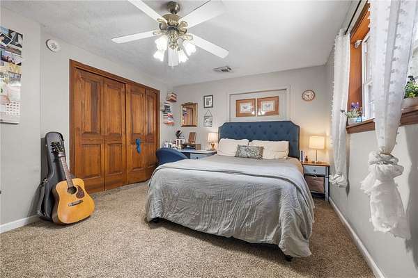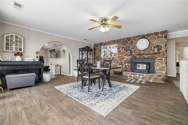 - Attic, Cathedral Ceilings, Ceiling Fans, Eat In Kitchen, Pantry, Walk In Closets, Window Treatments, Wood Burning Stove