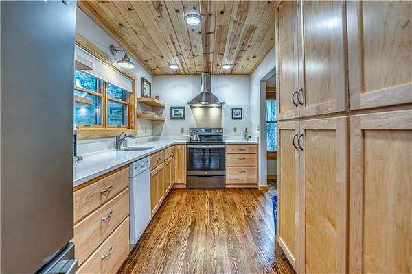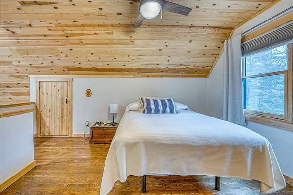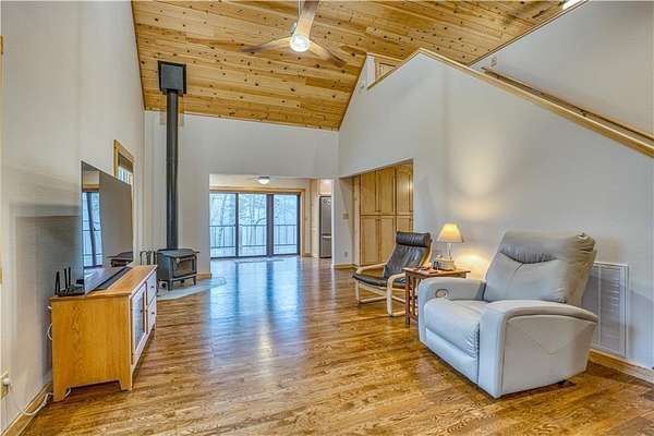 - Blinds, Cathedral Ceiling, Ceiling Fans, Eat-in-Kitchen, Granite Counters, Walk-In Closets, Woodstove