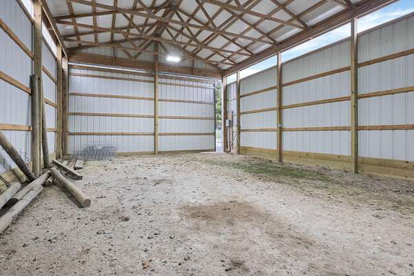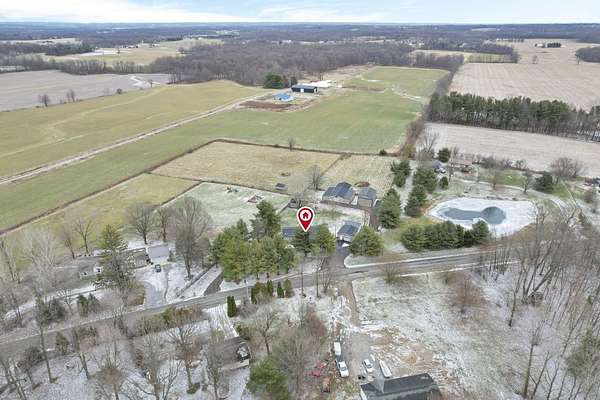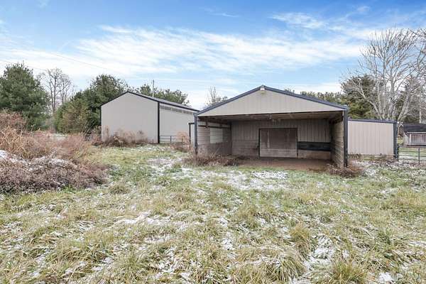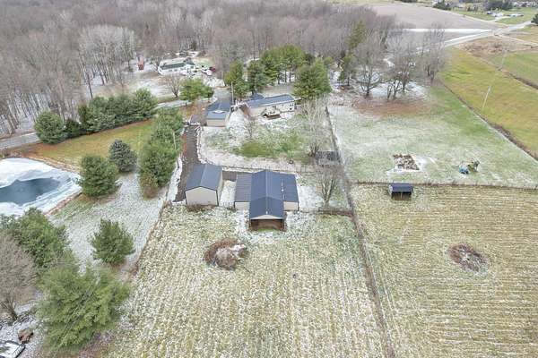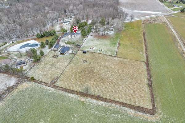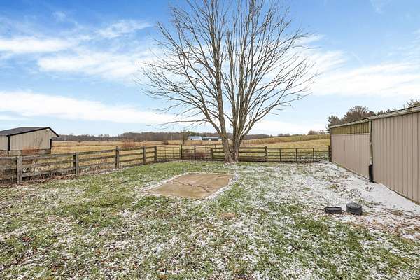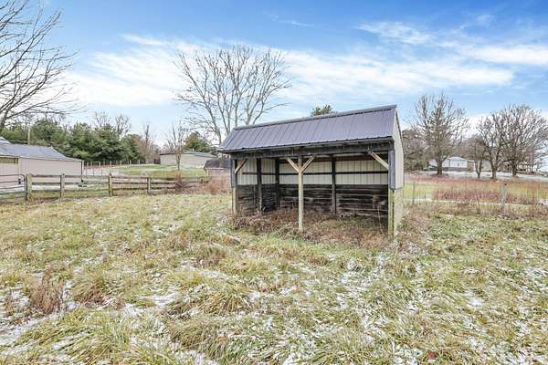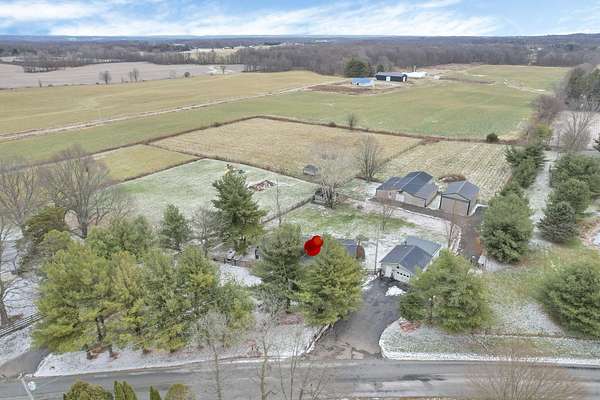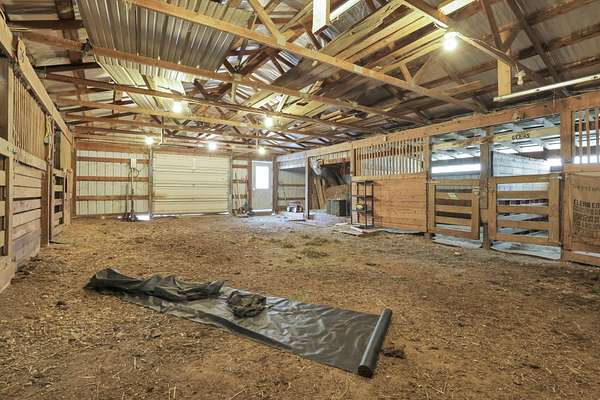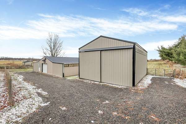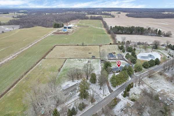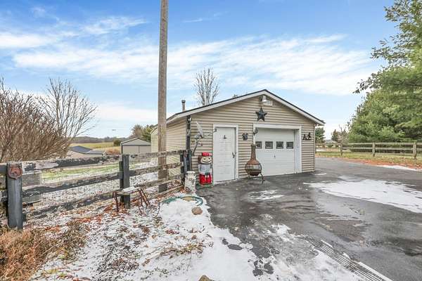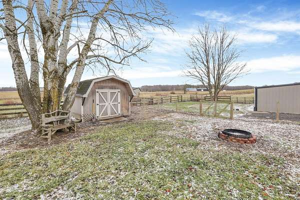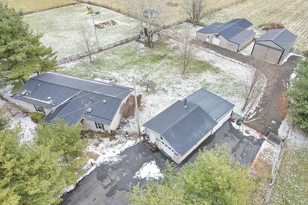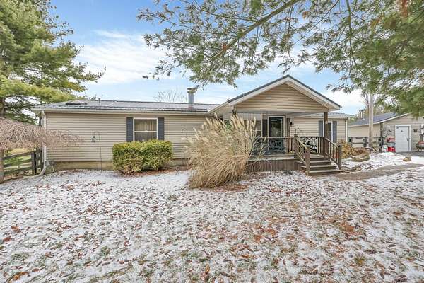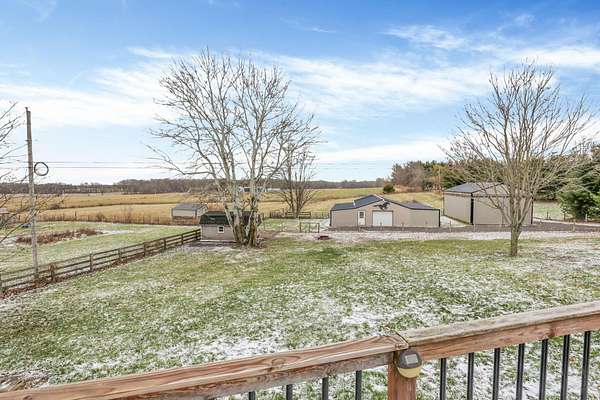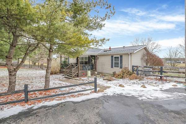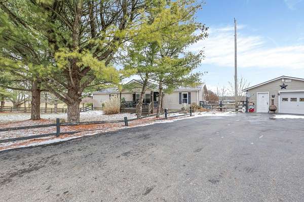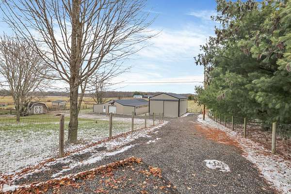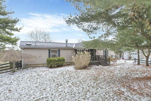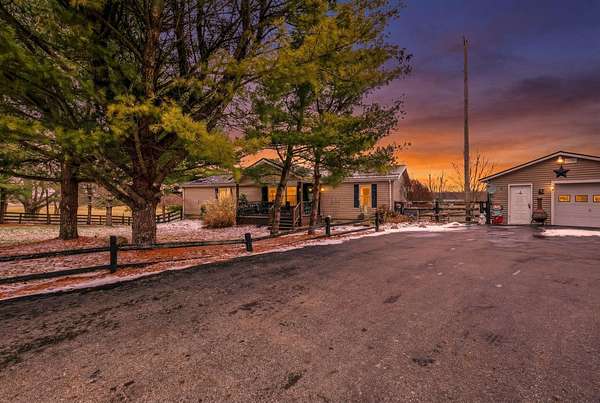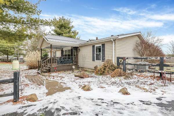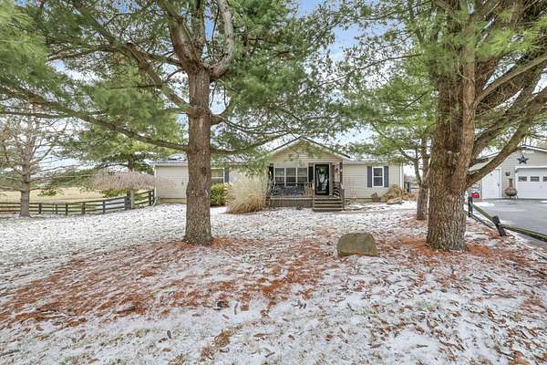 Step onto the welcoming front porch with custom railings and fall in love with this beautiful 3-bedroom, 2-bath, open-concept ranch home. Perfect for a horse or mini-farm setup, this property offers both comfort and functionality on nearly 4 acres. Inside, gleaming hardwood floors flow throughout the spacious layout filled with natural light. Enjoy a dedicated den, a large kitchen with upgraded Hickory cabinets, gas range, and generous eat-in space, plus a separate dining area ideal for larger gatherings. The exterior is just as impressive, featuring a heated 2-car detached garage with additional storage in rear of garage. A 48' x 40' horse barn with 8 functional stalls, A 352 sq ft lean -to and an additional 24' x 36' outbuilding for equipment storage. Two fenced pastures--one with a lean-to shelter--provide excellent options for animals or outdoor hobbies. Relax on the back deck and take in the peaceful beauty of this exceptional property. A rare opportunity to enjoy country living with all the conveniences you need.
