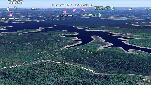 From Yellville, Hwy 62/412 E to Gassville, L on Hwy 126 to Hwy 5 N, cont. to L on US-160 to L on Hwy P. Road will become county road 651 in Dugginsville, cont. to state line, road becomes CR 164, R on Round Robin Lane 1/4 mile to L on Private Road to prop