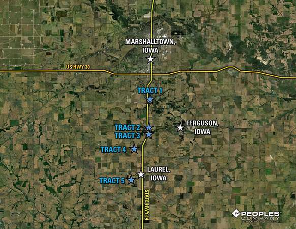 Marshall County, Iowa Online Only Farmland Auction! - BIDDING IS CURRENTLY LIVE and set to conclude on Tuesday, March 3rd, 2026, at 1:00 PM CST! Peoples Company is pleased to present 223.69 acres m/l of productive farmland with building site potential in Southeast Marshall County, Iowa along the State Highway 14 corridor. The sale consists of five productive, tillable farmland tracts located south of Marshalltown, Iowa.