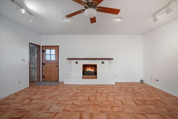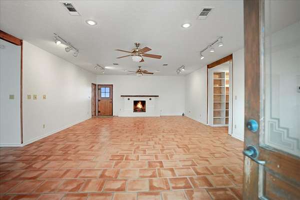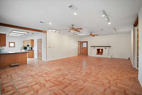 Open living area with wood & gas-burning fireplace and mesquite wood mantel