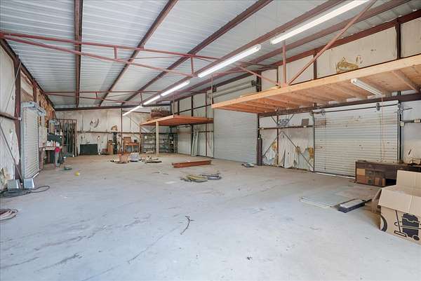 60' x 30' shop with mezzanine storage, four bay doors, covered workspace at rear, and 1,500-gallon water capture tank