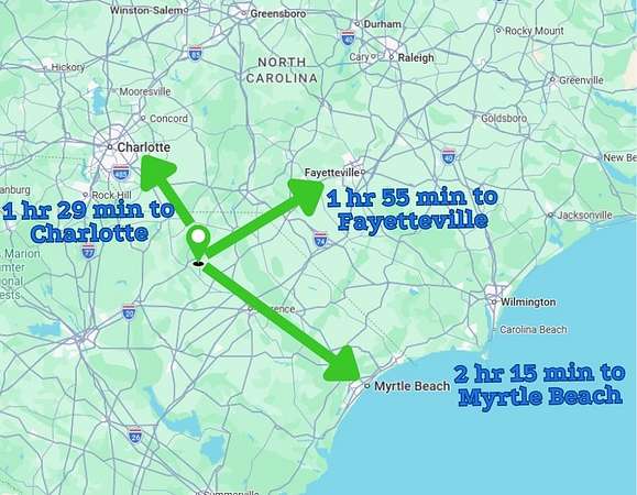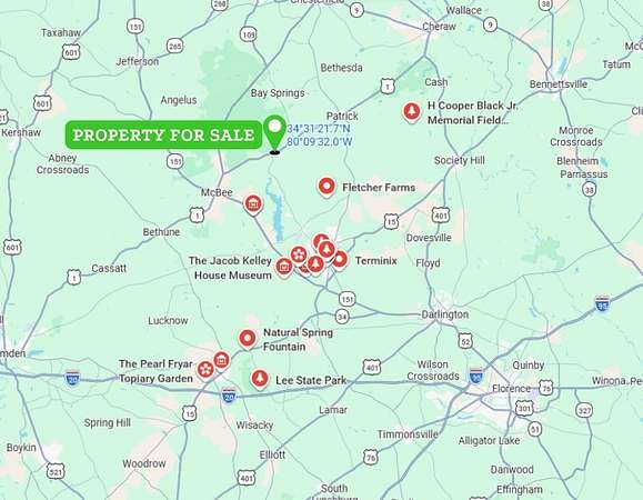 Located in the Pee Dee region of northern South Carolina approximately 8 minutes from McBee for daily needs and schools, 25 minutes from Cheraw for parks and river access, and 55 minutes from Florence for hospitals and regional services. The North Carolina state line sits approximately 30 minutes away. The Pee Dee region offers outdoor recreation including fishing, hunting, boating, and access to Kalmia Gardens near Hartsville and Pee Dee River. South Carolina's manageable property taxes and rural county regulations make land ownership practical for everyday use in this small-town setting.