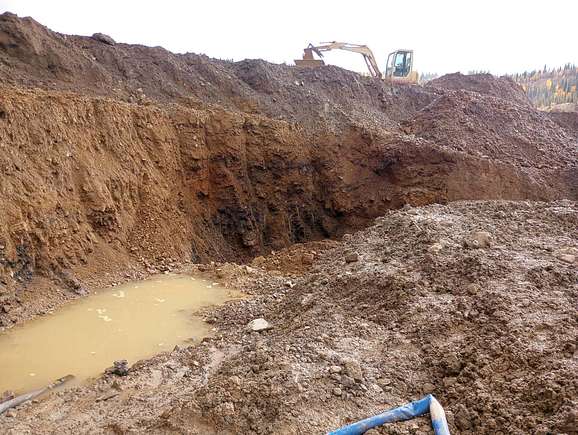 Mining began in 1911, with operations shifting from hand methods to mechanized equipment like draglines and bulldozers by the 1930s. Large-scale mining continued until 1986, with intermittent activity afterward. From 1911 to 1986, the mine produced at least 53,990 ounces of gold and 12,520 ounces of silver, with peak production in the 1930s and 1950s. Fossils found in the area date back 36,000 years, and reserves remain undetermined, with coarse nuggets still being discovered in old tailings.