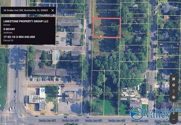 Est $423/moZONED R2B per Seller, single family or multi-family dwellings can be built. Nice level lot in a fast growing location with very convenient access to Redstone Arsenal, Research Park, Huntsville Hospital, Stovehouse, Lowe Mill & more. 6 total lots for sale, 5 adjoining lots to this one. 2 of them face Drake Ave.