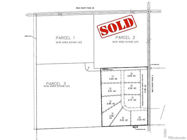 Rare opportunity to acquire 37.00 acres in Weld County with a proposed 9-lot estate subdivision. Preliminary subdivision layout creates nine 2-3.5 acre lots positioned for custom homes in the $2.0M-$3.0M range. Based on current luxury rural sales averaging approximately $2.5M, projected finished lot values support the $450,000-$500,000 range per lot.Ideal for: Custom home builder Boutique developer Investor seeking horizontal value-add opportunityProperty is located at the intersection of County Road 36 & County Road 3 with utility coordination initiated (see associated utility service documentation). The listing price of $2,000,000 reflects a strong basis relative to the projected finished lot retail value of approximately $4.5M. Subdivision plans and supporting materials available upon request.