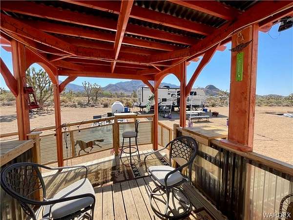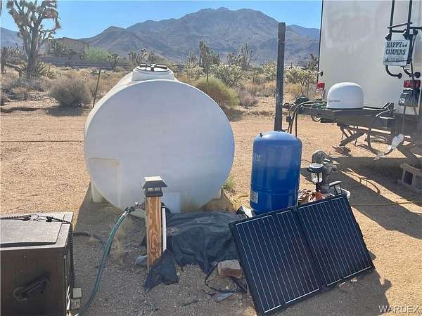 *ONE-OF-A-KIND OFF-GRID RETREAT ON 2.09 CLEARED ACRES! TURN KEY RV LOT!!!* Freedom, privacy, and jaw dropping scenery define this meticulously developed off grid oasis with NO HOA. Enjoy the flexibility of true off grid living with public power conveniently available at the property line if desired. Thoughtfully landscaped with19 stunning Joshua trees, this property is bordered by BLM land, offering endless ATV trails and open exploration right out your back gate. Five years in the making, this turnkey campsite is build ready or perfect for an elevated RV lifestyle. Perched high with a gentle slope, the land delivers panoramic mountain views, sweeping valley vistas, orchard views, unforgettable sunsets, and pristine night skies ideal for star watching. Designed for gatherings and comfort, the property features (4) septic hookups, two futures, an 8'x16' porch with solar lighting, outdoor oven, handicap ramp, and an adjoining laundry room complete with washer, dryer, and chest freezer. Wildlife lovers will appreciate frequent sightings of mule deer, desert bighorn sheep, quail, dove, bobcat, and coyote. Adventure awaits just minutes away!!! Lake Mead offers world class fishing for striped bass, largemouth, smallmouth, and rainbow trout. On site, you will find a 40' high cube container shop/bunkhouse with shelving and furnishings, plus an additional 20' container for extra sleeping or storage. A robust off grid system is already in place, including a 1,000-gallon water tank, solar-powered pump system, additional portable water totes with trailer, backup generator, two breaker boxes, and underground wiring for a 12-panel solar array. Outdoor amenities include a brick fire pit, portable fire pits, large propane/wood BBQ, and a full array of tools, seating, and decor, everything you need to start enjoying immediately. Ideally located near Music Mountains, Lake Mead South Cove, the Grand Canyon Skywalk, and within reach of Meadview, Kingman, Laughlin, Henderson, and Las Vegas. *Rare opportunity. Unlimited freedom. Unmatched views.*