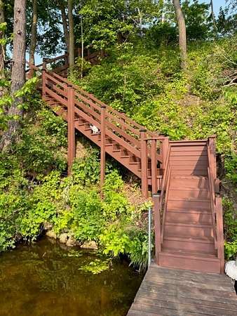 This rare Tainter Lake Vacant Land Property doesn't happen often...1.11 acres of stunning Lake views. Watch the sunrise overlooking Lower Tainter Lake, there is a newer set of steps to the lake with your floating dock included. Great building area all set to build your DREAM HOME, 200 amp electricity is already on the property, with bonus camper electric set up. Seller will leave the canvas shed and landscaping rocks. Fiber Optics at the road. Enjoy all the great fishing and boating, summer events, great restaurants you can boat too enjoying Lake Life! This location is just 5 minutes to all the shopping access you will need. (Refer to the DNR website for Tainter Lake water Quality)
