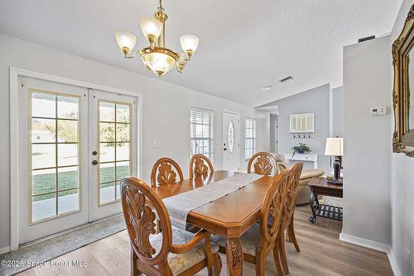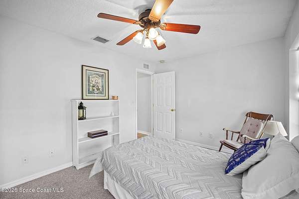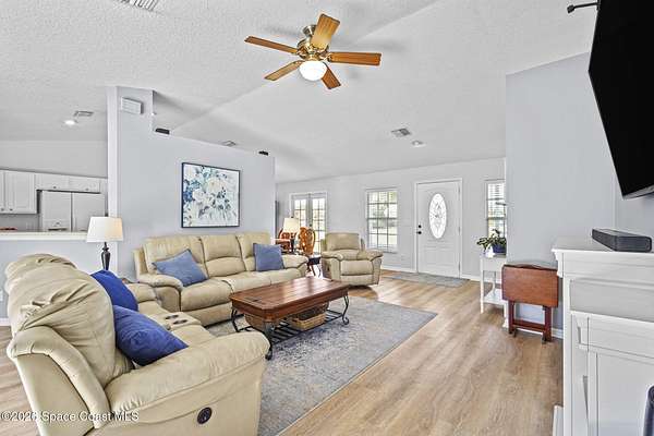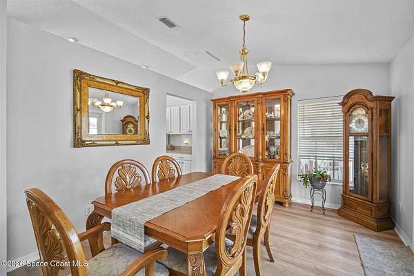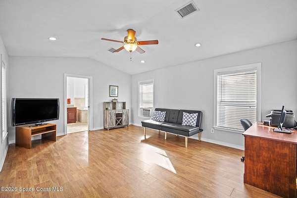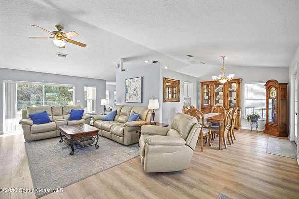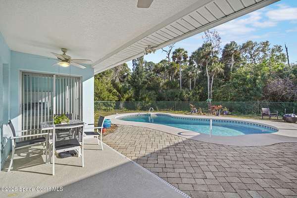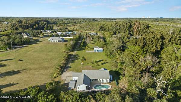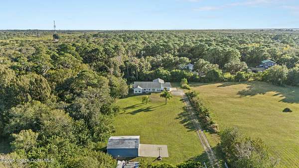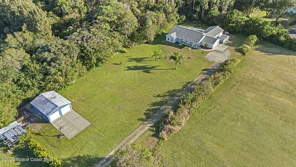 Beautifully situated residential home in a well-established N. Merritt Island neighborhood, offering a 1.5 acre lot with mature surroundings and wooded adjacent property that provides your own private back yard oasis . The level site is well suited for residential living and offers generous space for both indoor comfort and outdoor enjoyment. The property features a private drive with expansive outdoor living areas, including an open lanai with fenced in pool, multiple utility sheds and a additional 720 square foot detached garage with concrete slab - ideal for storage, workshop use, or additional recreational needs. The interior has an open floor plan with vaulted ceilings giving the space an open and airy feel making it perfect for entertaining. This three bed three bath has an attached mother in law suite / game room with a private bath and walk in closet giving you multiple options for living configuration and function. Roof and pool equipment 2 years old.