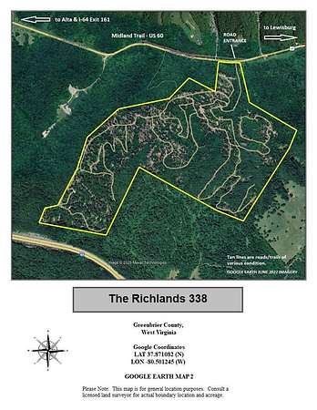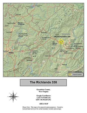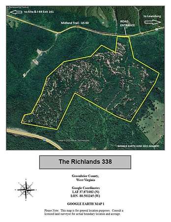 OVERVIEW The Richlands 338 is a well-rounded property that highlights much of what makes southeastern West Virginia special: rugged scenery, clear and cold rivers, endless outdoor recreation, and an agreeable four-season mountain climate. Convenient access to the historic town of Lewisburg and the amenities of the Greenbrier Resort balance this mountaintop forest's privacy and rural character, making it an accessible retreat with broad appeal. HIGHLIGHTS 338+/- contiguous acres - multi-use, timber, recreational, and residential Richlands 338 is in the heart of a biological, historic, and recreational mecca First time on the market for nearly a century Five minutes to Historic Lewisburg and small city amenities Wildlife Habitat Improvement Harvest conducted in 2022 Diverse and abundant residential wildlife population Four season climate Near total darkness and minimal noise pollution Cultural & educational opportunities throughout the region Seven miles of interior roads and trails (See Maps & Documents for map of interior roads) Shooting sports, ATV- horseback riding, hiking, camping, hunting, nature viewing Suitable for residential or cabin development Elevations range from 1979 ft. to 2325 ft. Low taxes, low population density Jet airports - Blacksburg, Pittsburgh, Charleston, Lewisburg, Charlotte Can create a lasting generational legacy OWNERS' NARRATIVE 100-YEAR HISTORY OF THE GILBERT GREENBRIER PROPERTY Dr. Lewis D. Gilbert May 3, 2025 In 1921, our grandfather, Lewis Neuman Gilbert, ("Poppaw Gilbert"), a logger, blacksmith and coal miner from Ronceverte, WV, purchased the original 170-acre tract of land in Greenbrier County with the apparent notion that the property was very close to the Organ Caves/Lost Caverns. Folklore was that these caves still held hidden Civil War treasures of GOLD left there by the Confederates when Confederate paper money was no longer being accepted as legal tender and subsequently hidden there from the Union soldiers to be later recovered. The Gold was never found. Nevertheless, forty years went by and in the 1960's, the US Federal Interstate Highway system came through Greenbrier County, cutting the right of way of this property away from the Organ Caves/Lost Caverns connection. The property was rich in wildlife, big game, as well as huge American Chestnut trees that were 3 to 4 feet in diameter. (It was later discovered in the early 60's the Chestnut trees were cut down and "stolen" from the property!) In 1962, Lewis Neuman Gilbert passed away leaving his three sons- WF "Pete" Gilbert, Arthur "Arch" L Gilbert, and Jack "Jack" D Gilbert, Sr., the original 170 acres property. In the mid 1960's, the Gilbert brothers were approached by a lumberman to timber the property. In doing so, the lumberman not only paid them for the lumber, but he also agreed to obtain and transfer a Right of Way to Route 60 (now the gate entrance) and bought and transferred an additional 168+ acres to the Gilbert brothers, that now represents the existing 338.58 acres of the Gilbert Property. The lumberman also created/improved the now existing hunting access/logging roads. Since the 1960's the property has been primarily used for family game hunting and ATV recreation/camping. In 2009, Arthur L. Gilbert passed away, leaving his 1/3 of the Property to his son, Dr. Lewis D. Gilbert. In 2012, WF Pete Gilbert passed away and left his 1/3 to his surviving brother, Jack D Gilbert, Sr. The current owners of the Property are Jack D Gilbert, Sr. 2/3 and Dr. Lewis D Gilbert 1/3. Approximately five years ago, a carefully selected harvest of timber was conducted by Certified Foresters to enhance grassland areas for the benefit of upland game and the deer population. Timbered areas were reseeded with quality grasses to restore the grasslands. The logging roads were also improved to gain better access to the far regions of the property from the Route 60 gate entrance.