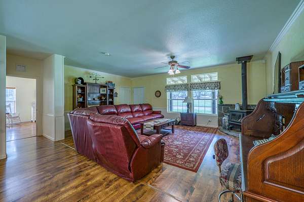 To the left of the John Deere is the stone home. This stone face, 360 degree home with a total wrap around covered patio is a 1200 square foot 2 bedroom 2 bathroom with appliances, a wood burning fireplace, on demand hot water heater and central heat and air. The view of the giant oaks and pond from the front windows and porch are unmatched beauty.