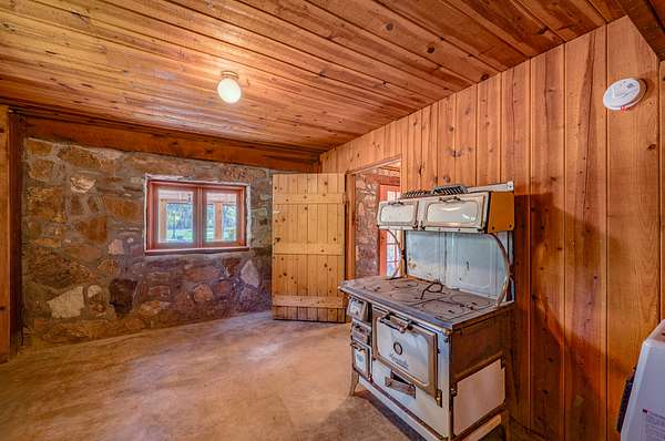 On your furthest left is the ranch house. This beautiful log exterior ranch-style home, is approximately 2400 square feet with 4 bedrooms, 2 baths w/shower & 1 bathroom w/tub. It also includes a full kitchen & dining, large living room with wood stove and a mudroom with washer and dryer. The huge front porch looks directly towards the pond. With a garden area and chicken coop nearby this is the perfect spot to become one with nature surrounded by giant oak trees.
