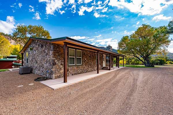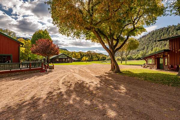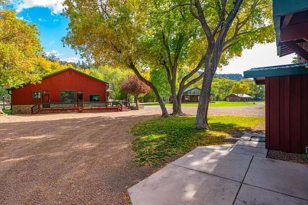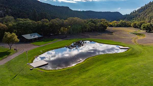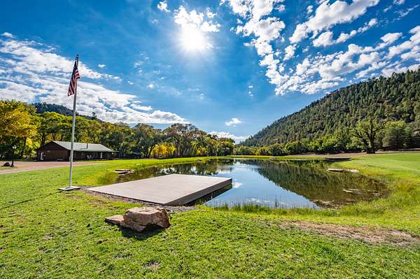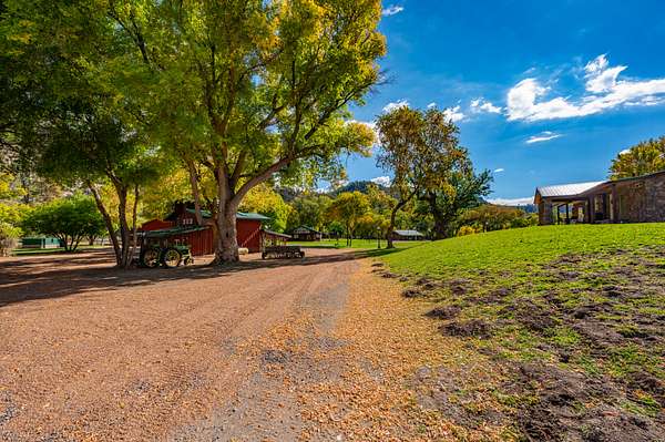 Just a short 65 yards from the pavement you will cross through the beautiful one-of-a-kind log entry and then cross the Apache creek and within another 100 yards will come upon the large 20 acre meadow with a half acre pond in the center with 2 homes on the left and a diner, 2 homes, a shop/barn and a cabin complex on your right.