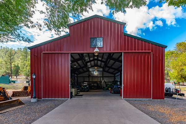 Behind the John Deere home is the fully insulated drive thru 70X40 metal red shop/barn. It comes with plenty of space for your toys and the equipment needed to keep these beautiful grounds in tip-top shape.
