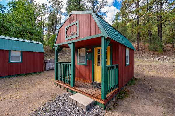 Next door to the right is the John Deere home. This is a multistory cabin-style home encompassing three levels. It includes a greenhouse, a large storage room and 2 bedrooms on the main level. Go upstairs to find a bedroom, kitchen and bathroom w/ shower. One more level you find the rest of the 2665 square feet in a small loft, living area and a walk out balcony with the best birds eye view on the entire property.
