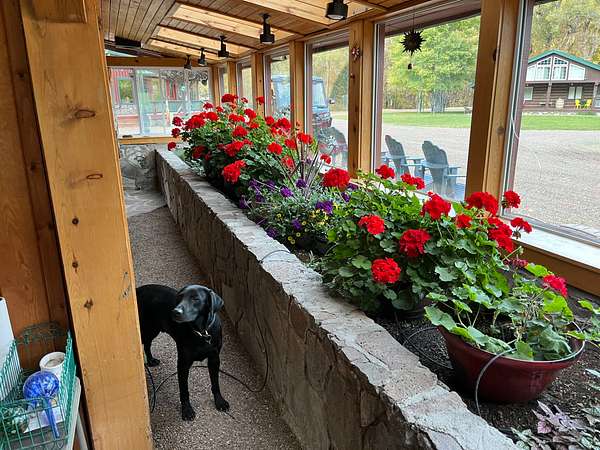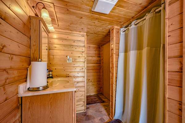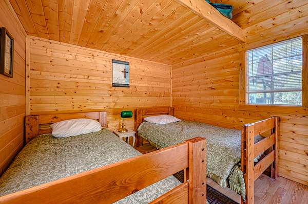 Just out of sight and behind the barn is the cabin stays complex (4 cabins) with separate mens & womens bathrooms w/showers. Each cabin is 160 square feet, insulated and beautifully done with tongue and groove pine interior and sleeps 4.