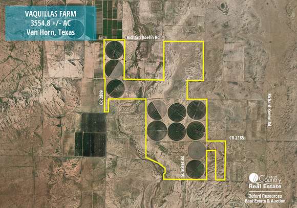 This is an exceptional opportunity to purchase irrigated farm land and invest in water in West Texas. Vaquillas Farm is located in Van Horn, Texas in the Culberson County Groundwater Conservation District.
