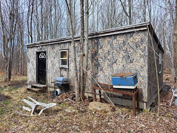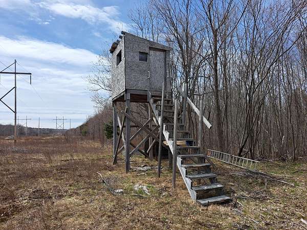 There is an old hunting camp at the front of the property, which is a tear-down. There is also an elevated hunting blind at the powerline ROW, which would require a new roof to be fully-functional.