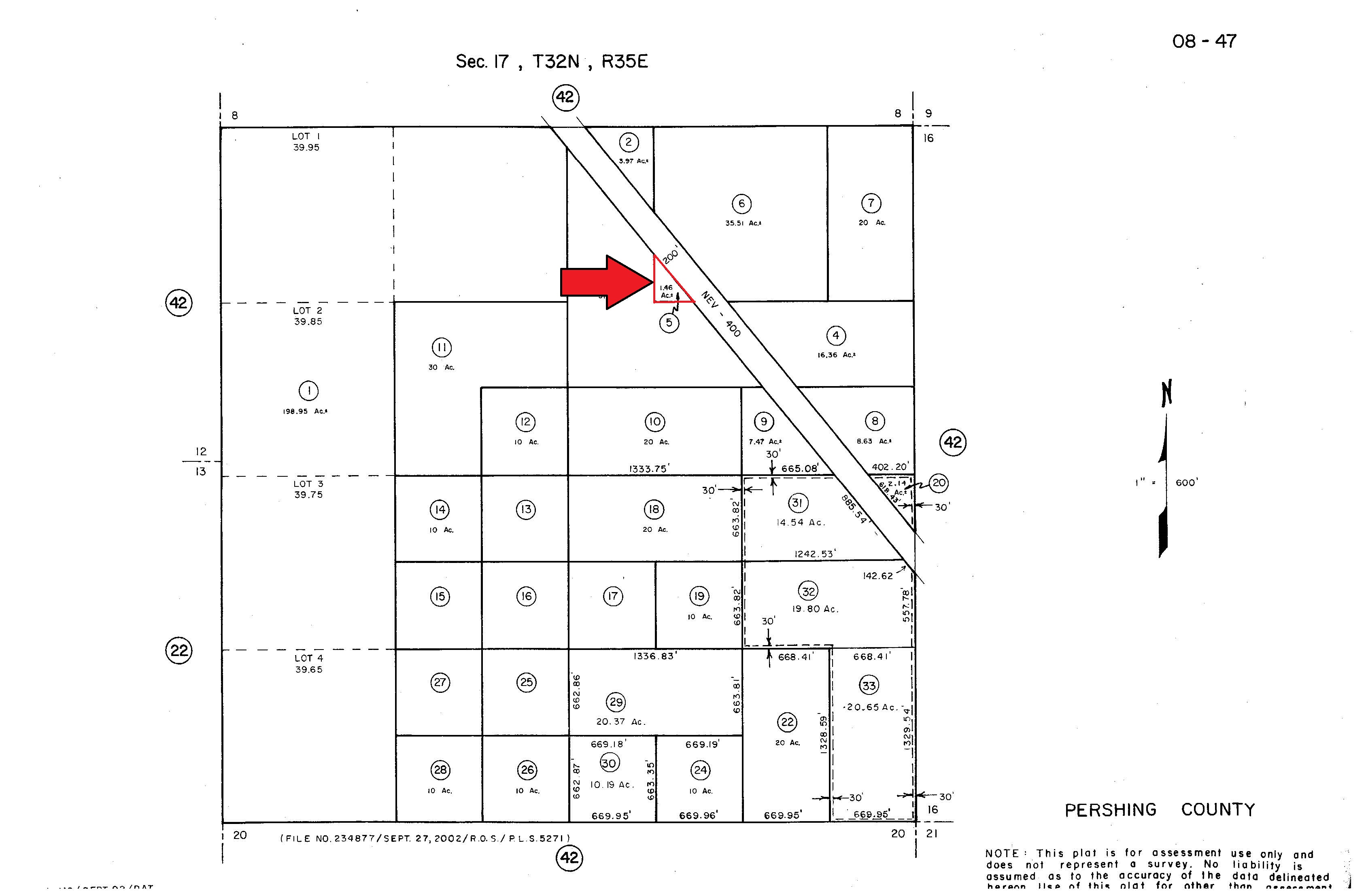 That portion of the E½ NW¼ NE¼, Section 17, T32N, R35E, MDB&M, lying Southerly or Southwesterly of the Southerly or Southwesterly right of way line of Nevada State Highway 400 (Unionville), per Document #214302 recorded in Book 321, Page 81