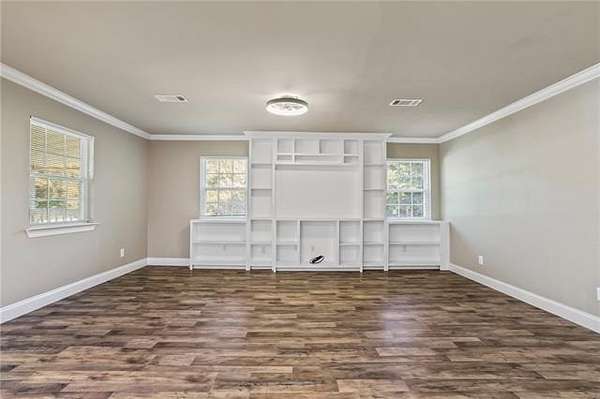 A wide, welcoming front porch sets the tone for relaxation and outdoor enjoyment. Inside, you'll find a large open floor plan that creates a seamless flow between the living, dining, and kitchen areas. The living room features built-in shelving, adding both character and convenience.