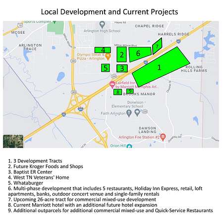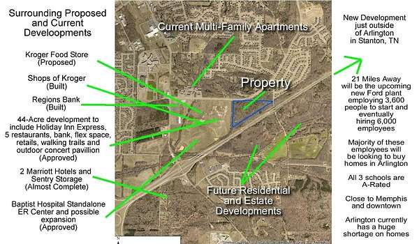 Sellers will subdivide up to 10 acres, at a premium. Largest mixed-use development tract left in Arlington. Situated by the new Baptist ER, new Kroger, new VA center, Arlington HS, upcoming Holiday Inn, chain restaurants and more. Many development options on this site for national chains, flex space, SFR, retail, medical centers, loft apartments or special purpose. Existing cell tower and utility easement does not convey. Located close to the new Ford plant. Close to Blue Oval City. The new Ford plant will require 100's of new homes in Arlington ideal for these development tracts. Sewer recently installed. Located right off I-40 for prime location and convenience to everything and close to Memphis. In the TN Greenbelt tax savings program. All public utilities available & timber value.