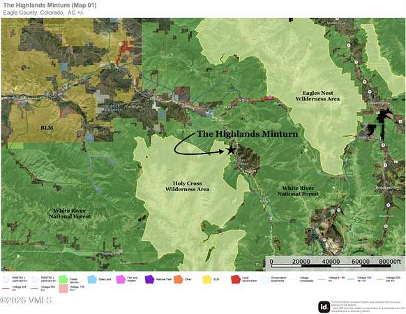 Never on the market before now: 'The Highlands Minturn', Parcel B, is a +/- 32.68-acre track outside the town core of Minturn, Colorado. The entire 'Highlands Minturn' property [+/- 55-acres] is comprised of Parcel A [+/- 22.286-acre tract listed for $4,865,408] and Parcel B [+/-32.68-acre tract listed for $7,134,592], which are available for purchase individually or together as one. Located near the Eagle River and backing up to the Holy Cross Wilderness Area of the White River National Forest, 'The Highlands Minturn' is truly a once-in-a-lifetime chance to own a piece of Colorado's history. Incorporated in 1904, 'Minturn' is a historic Rocky Mountain mining and railroad town situated a short distance to Vail [10 miles], Beaver Creek [12 miles], the Vail Valley Jet Center - EGE [36 miles], and Denver [107 miles]. The real estate offers an off-the-grid landscape with views to Vail's Back Bowls [Sunup Bowl & Chair 9], Mount Jackson [13,675'/4,168 meters], and the breathtaking cliffs of Minturn. At an elevation of +/- 7,860'/2,395 meters, this undeveloped acreage is gently sloped and has multiple building sites to create your Colorado mountain getaway. 'The Highlands Minturn' is arguably one of the most special places in the Vail Valley. It provides privacy, direct access to the wilderness, wildlife, hiking, skiing, mountain biking, solitude, views, and a rare opportunity to create a legacy for future generations. An interactive map of the properties is available upon request. ['The Highlands Minturn' - Highlands 2, Parcel B: 39 degrees 33'04''N 106 degrees 24'51''W]
