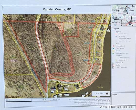 Here is an outstanding Offering of Land Tracts and a large Lakefront Lot with 2nd and 3rd Tier Acreage with Water Views. The "4th Tier" Tract of 5.4 Acres, more or less, does not face the Lake, just the 2nd and 3rd Tiers face the Cove with Main Chanel views. All Parcels are ready for Development in one of the most desired Coves at the Lake of the Ozarks - Laurie Hollow Cove. Mistwood Airport (24MO) is just up the hill from this approximate 19.83 Acres, more or less. The opportunity to Develop this once in a Lifetime area of ground is now available for purchase with endless possibilities. The POA (Property Owner Association) has already set up Mistwood Moorings POA. There is approximately 500 feet of Lakefront with approximately 300 feet of Concrete and Rip Rap Seawall already established. The 6.5 Acres, more or less, of 2nd Tier and a 3rd Tier at approximately 6.7 Acres, more or less, have elevated Views of the Cove and Main Channel. You do not want to miss this opportunity to start this Land Development Offering with Blacktop on side of the perimeter Acreage. Close to all of the happenings on both sides of the Lake at the 35 MM. Let your Investment Adventure begin!