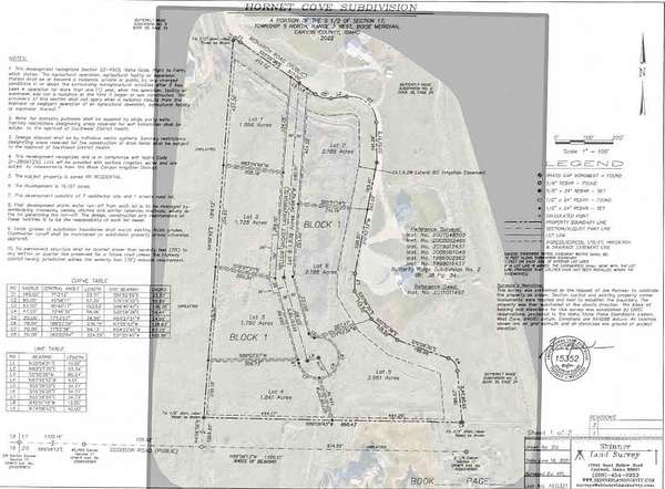 Rare opportunity to acquire the 16.19-acre, 7-lot Hornet Cove Subdivision, offering spacious estate-style homesites averaging 2.08 acres each! Per county code, each homesite may allow for an accessory dwelling unit (ADU), creating the potential for up to 14 residential dwellings within the development and offering attractive flexibility for multigenerational living or added residential use. Ideally located near the interstate, Purple Sage Golf Course, and adjacent to Butterfly Ridge-an area known for upscale estate properties, outbuildings, and a desirable country setting. The property features gently sloping topography, beautiful Boise Ridge Mountain views, full irrigation rights, and the kind of usable acreage that is increasingly difficult to find. Located in Caldwell and within the highly sought-after Middleton School District, this is an outstanding opportunity for a developer, builder, or investor to bring a high-demand acreage community to life. Drive by today and see the potential for yourself!