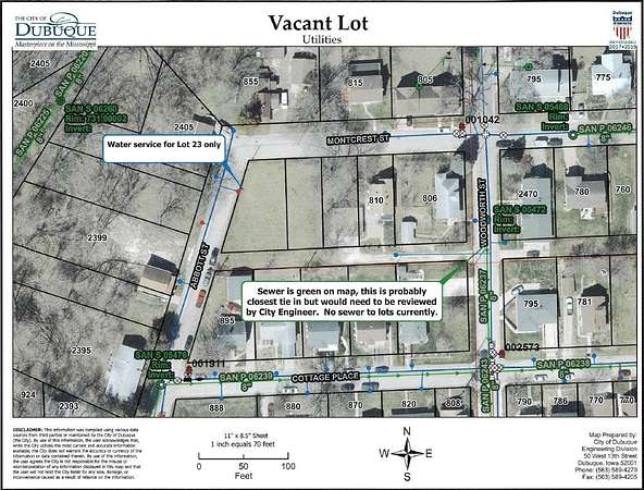 Est $233/moCome see this almost secret neighborhood in Dubuque and consider all the options. Buildable lots for a modest home with some utilities to curb. With 0.21 acres to do as you wish, you can make this a great place to call home. Could be a great investment opportunity. Water to curb with gas, electric and sewer close. Call agent for specifics on what size home could be built on the property with specifications from Planning and Zoning. Directions: Take Kaufmann Avenue to Hempstead Street, up Montcrest to the corner of Abbott. 2 parcels ready to go. Call for details!