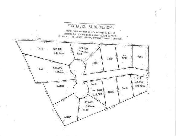 Est $265/mo1.24 Acre lot in Fox Haven, a restricted subdivision of nice brick homes. With the feeling of seclusion yet with all of the city conveniences. The back of property is tree lined and great views deer and turkey. If you are thinking of building make sure and put these lots on your list to view. Located 1/2 way between Joplin and Springfield with easy access to I-44. Several other lots to choose from with some perfect for walkout basement homes or level for homes without basements. Pick between wooded or open lots. See Plat map attached. Part wooded.