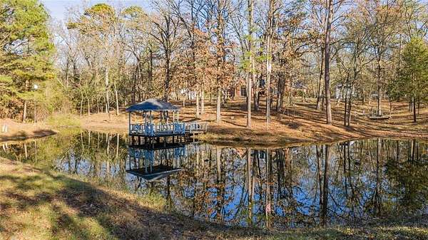 Inside, the home features two spacious living areas and two dining areas, perfect for both everyday living and entertaining. The large, updated kitchen is the heart of the home, offering ample space for gatherings and meal prep. A sunroom provides the perfect spot to relax or could be a game room, while the covered back patio is ideal for outdoor enjoyment year round. The primary suite is located downstairs with a private master bathroom, offering convenience and comfort. A full guest bathroom on the first floor is located near the kitchen. Upstairs, you'll find three additional bedrooms and one more full bathroom, providing plenty of room for family or guests. Outdoors, the property is equally impressive with multiple carports, including a dedicated RV carport, along with a workshop offering excellent space for hobbies, storage, or projects. With its combination of acreage, pond, living spaces, and versatile layout, this property delivers the perfect blend of privacy, functionality, and country elegance. You can have all of this just minutes from town and only one mile from the marina, park, and boat ramp at Lake Cypress Springs. This is an AS IS sale. Please do not walk on walkway to the gazebo at the pond. The boards are damaged and are not safe.