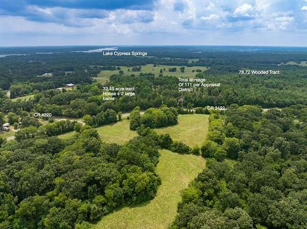 Enchanting, wooded 109 acre "Gentleman's Farm" that has been in one family for 60 years. One mile from Lake Cypress Springs, the property has been expertly maintained & improved to create a one-of-a-kind family retreat in the East Texas piney woods. Stylish 3100 sq ft 3-bedroom home, partially air-conditioned wood barn and a 1200 sq ft metal barn, all in a multi-acre clearing + many more acres of trails in the woods for family adventure and hunting, and camping, the property is the perfect retreat for those who love Mother Nature! Enter a private world through a gated entrance and into the woods before reaching the landscaped and irrigated clearing with the property's bespoke ranch house and barns. The 3 bedroom house (+ 2 large living areas) has had multiple 1st class updates and now encompasses a lodge-like "great room", an open kitchen featuring Subzero and Thermador appliances, and a resort-like first floor primary suite, complete with an exercise room. On the second floor are two sleeping areas, one loft-like and one private, with a shared bath. Those familiar with East Texas say this is one of the prettiest properties in Franklin County with an abundance of mature trees. The property has an Ag Exemption for cultivating and harvesting trees. A 2-hour drive from Dallas, this is a wonderful retreat or full-time residence for those who love the outdoors, hunting and boating. Though not on the lake, the nearby marina, one mile away, makes lake and boat access easy. The home is beautifully decorated with a South West design motif. Most of the furniture and art (as well as the tractors, boats and 4-wheel gators) can be bought with the property making it a "turn-key" purchase. This property has been loved by 3 generations of the same family. Here is a unique opportunity to create a lifetime of your own memories!