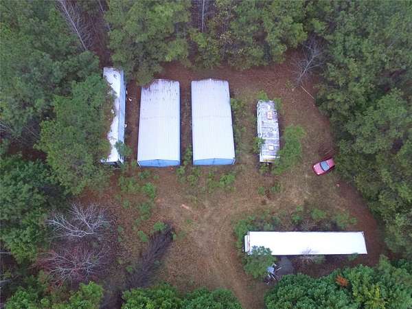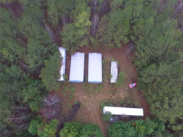 Est $836/moPrivate unrestricted 11.65-acre wooded property with paved road frontage, natural terrain, and a secluded setting. The land includes a gated entry, some fencing and a cleared area with two existing metal storage buildings and mobile units/trailers. Aerial views showcase the size, layout, and depth of the property, offering a quiet and spacious tract with a mix of open and wooded areas.