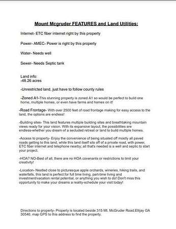 17.67 Unrestricted Acres | Mountain Views | | STR or Multi-Home Opportunity. Exceptional opportunity to own 17.67 acres of prime, unrestricted land in the highly desirable North Georgia mountains of Ellijay. This remarkable property offers a brand-new survey, lots of road frontage, and A1 zoning, creating unmatched flexibility for a high-performing short-term rental development, private mountain estate, family compound, multiple home sites, or farm-style living. Just do the soil work and bring a builder to begin! No soil work completed yet. The land showcases breathtaking long-range mountain views, multiple ideal building locations, and a peaceful natural setting while still maintaining convenient accessibility. Located just off mostly paved roads, turning to gravel on the private road, the property has power, fiber-optic internet, and telephone available nearby, making future development simple and efficient. Dig a well and septic are needed to begin construction.Positioned in one of North Georgia's most sought-after tourism and outdoor recreation areas, this property is surrounded by apple orchards, wineries, hiking trails, rivers, and waterfalls, making it perfectly suited for vacation homes or income-producing rentals. Despite the private, scenic feel, you are less than 15 minutes from downtown Ellijay, providing quick access to restaurants, shopping, entertainment, and local events.With no HOA, no covenants, and no restrictions, combined with an active appraisal already completed, this is a rare large-acreage offering with outstanding investment potential, development flexibility, and long-term value in a rapidly growing mountain market.Property is to L and R of 315 Mt Mcgruder Road, Ellijay GA 30536. From Hwy 515. In 2.2 mi, turn L onto First Ave. In 600 ft, turn R onto Hwy 52 E. IN 5.3 mi, turn L onto Big Creek Rd. In 9.7 mi, turn R onto Rainbow Ridge In 150 ft, turn R on Mt McGurder Road. In 0.3 mi, turn L. Property is on both sides of 315 Mt Mcgruder Road.