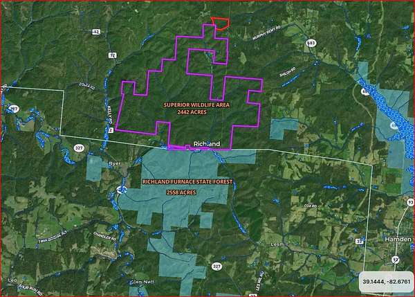 Beautiful hardwood timber can be found throughout this 36-acre tract, making it a solid investment that provides ROI at any time. The 1400 feet of paved road frontage provides a nice buffer from neighboring properties and future lot-split potential. Residential electric service is located on the property. Another bonus is that this property borders the 2,442-acre Superior Wildlife Area, which in turn borders the Richland Furnace State Forest for a total of 5000 acres of public hunting. Conveniently located just south of SR 50, 30 minutes SE of Chillicothe, and 15 minutes from McArthur. Call the listing agent for details. - No deed restrictions. - Marketable timber. - Good Verizon cell service. - 1400 feet of paved road frontage. - Located in Richland Township. - Vinton County Local School District. - Sellers' interest in mineral rights are included. - GPS: 39.222918 -82.595623 - Electric service available on the property. - On-site septic and water well would be required. - Real estate taxes are only $249 per year. - Parcel Numbers: 13.00689.000 - All information is deemed reliable but not guaranteed.