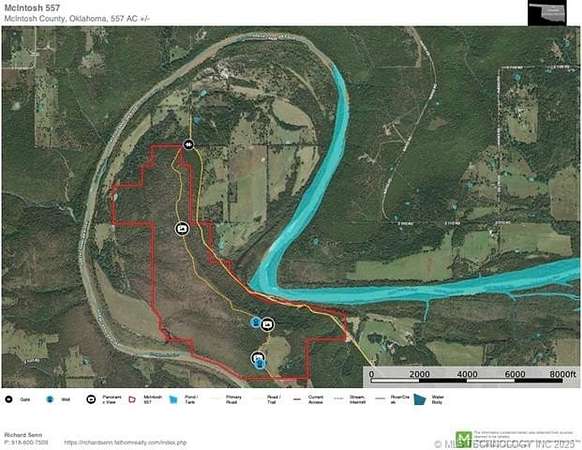 Discover a rare 557-acre riverfront paradise in McIntosh County, Oklahoma, perfectly situated between Henryetta and Lake Eufaula. Nestled within the dramatic horseshoe bend of the North Canadian River, this extraordinary tract sits atop 200-foot bluffs, offering breathtaking, near-360-degree views of the river and rolling countryside. This one-of-a-kind property is a haven for outdoor enthusiasts, with direct river access for kayaking, fishing, or relaxing by the water's edge. The diverse terrain teems with wildlife, making it a hunter's dream, while the elevated landscape provides an ideal canvas for developing luxury cabins, an eco-resort, or a private estate with unmatched vistas. Imagine waking to stunning sunrises over the river or creating a legacy retreat in this secluded, natural setting. Located in a high-demand area near Lake Eufaula, this tract offers endless possibilities for recreation, investment, or a personal sanctuary. Don't miss this chance to own a piece of Oklahoma's finest landscape-schedule a private tour today to experience its beauty firsthand!