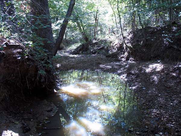 The property is easy to identify and walk. It slopes gently toward the creek. There are a couple of lower areas that can collect standing water during very heavy rains, but there are also multiple elevated spots that make excellent building sites. Most is gently sloping woodland that doesn't flood.
