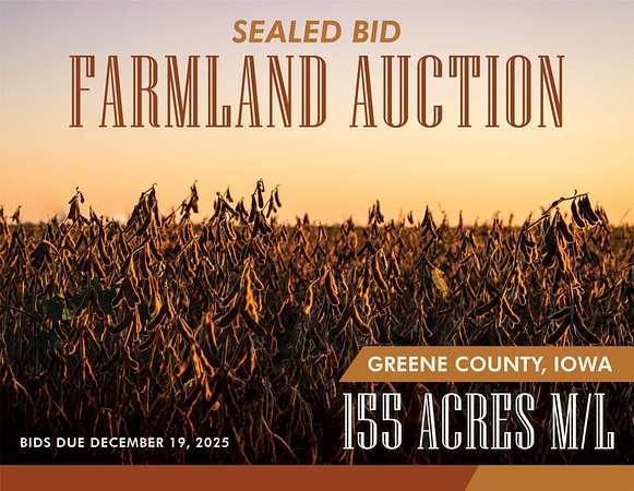 High-Quality Farm in Strong Farming Neighborhood Offered for Sale through the Sealed Bid Auction Method - Presenting 155 acres m/l of Greene County, Iowa farmland located north of Jefferson, Iowa. The farmland will be offered through a Sealed Bid Auction with all bids for the property due before 1:00 PM (CST) on Friday, December 19th, 2025. Bidders will have a single opportunity to bid on this farmland, and a live auction will not follow the Sealed Bid Auction. Please contact the Listing Agent for a copy of the form to submit your bid. Of the total 155 gross acres m/l, there are 144.93 NHEL FSA cropland acres with a CSR2 soil rating of 80.7. Primary soil types include highly productive Clarion loam, Coland clay loam, and Nicollet clay loam. The 2026 farming rights are available for the new buyer. Included on the tract is a grain bin built in 2010 that holds 16,000+ bushels. The seller has grain stored in the grain bin and will keep possession of the grain bin until June 1st, 2026. Access to the farm is from 185th Street, and Iowa Highway 4 runs along the western boundary of the tract, offering quick access to the Iowa Highway system.The farm is located in a strong agricultural community with several grain marketing outlets located nearby, including the Landus Co-op in Jefferson and the Louis Dreyfus ethanol plant in Grand Junction, Iowa. Visit our website for more information regarding this Auction.