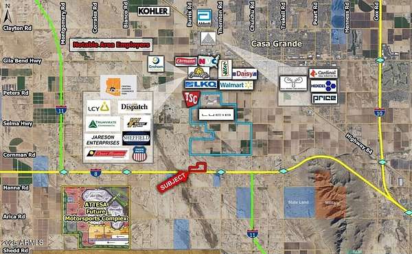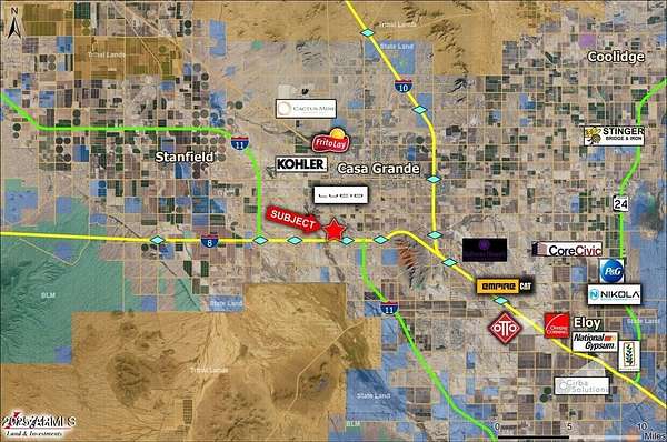 Prime 2 parcel, 60-acre industrial land opportunity adjoining Interstate 8 in Casa Grande, AZ-strategically positioned within Pinal County's UR/Employment growth corridor. This rare large parcel offers exceptional access, visibility, and infrastructure potential for manufacturing, logistics, distribution, renewable energy, data centers, or EV supply chain operations. With proximity to I-10 and I-8 interchanges, Phoenix, and Tucson markets, this site is perfectly suited for developers and corporations seeking to capitalize on Casa Grande's rapidly expanding industrial and technology hub. Unlock the potential of one of Arizona's fastest-growing economic region.