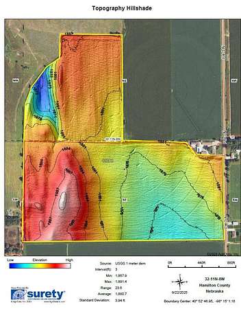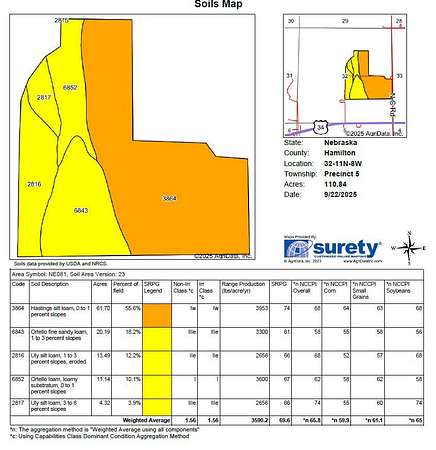 This highly productive tract is located in western Hamilton County and offers an excellent opportunity for farming or investment. The property features quality pivot-irrigated soils and is equipped with a Valley center pivot and GE 50 HP electric motor, both included in the sale. Situated near multiple grain markets, this tract provides strong accessibility and marketing advantages. A permanent easement is in place to allow access to the adjoining property to the west of the subject property. Equipment Included: Valley Center Pivot GE 50 HP Electric Motor. Full possession of the property will be available for the 2026 crop year.Location: From the intersection of Hwy 34 and North C Road in Hamilton County, travel north approximately 1/4 mile, the farm will be located on the west side of the road. Legal Description: North Half of the Southeast Quarter (N1/2SE1/4) and part of the Southeast Quarter of the Northeast Quarter (SW1/4NE1/4) Section Thirty Two (32), Township Eleven (11) North, Range Eight (8) West of the 6th P.M. Hamilton County, Nebraska contains 110.84 acres more or less. Possession of the farm will be on or before January 15, 2026. All information gathered from Hamilton County Assessor & Farm Service Agency is not guaranteed by the broker. All images are for illustrative purposes only and not guaranteed. Well Information: Well ID/Reg. Number: 26,421/ G-020216 Pump Rate: 1,200 GPM Pump Column: 8" Total Depth: 186' Static Water Level: 62' Pumping Level: 90' FSA Information: Farmland; 112.43 acres Irrigated Cropland; 105.20 acres Dryland & Grassland: 6.7 acres Corn Base Acres; 53.50 acres Soybean Base Acres: 51.70 acres Total Base Acres: 105.20 acres PLC Yields: 194 corn 57 soybeans *Please note that these acres and PLC yields are approximate or estimated, as they are tied with other parcels from the same producer. 2024 Taxes: $5,308.68