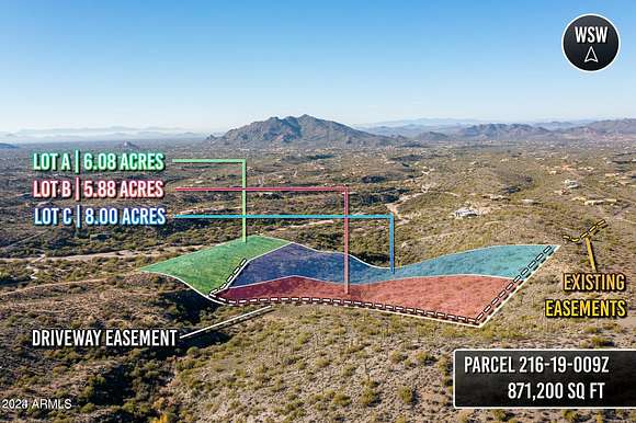 Stunning hillside lot with almost 6 acres of land on which to build your dream custom home! Enjoy serene seclusion, privacy and mountain views while being within a short drive of all the culture and restaurants that and Scottsdale has to offer! No HOA. This is 1 of 3 lots being offered. This property is Lot C on map. The seller will sell each lot individually or all together as 20 acres. Access is via recorded easements. The Town of Carefree Hillside Ordinance applies. See Tour Map in Documents prior to visiting the property.
