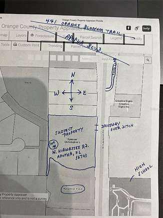 From intersection of Hiawassee Road and 441/Orange Blossom Trail, Go south on Hiawassee about 1/2 mile. Go past Apopka Blvd. Go up and over the bridge on Hiawassee that goes over the railroad track. At the bottom, you will see two manufactured homes on your right. The vacant land begins at the fence after the second manfactured home (Yellow in color). There is a cleared lot on the immediate right that you can turn into and park, if wanting to walk the lot. Be careful turning in. There are directionals and a signpost on the property facing Hiawassee.