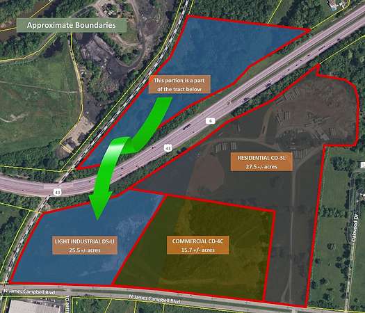 This is the light industrial portion of the 68+/- acre tract that is for sale. This property is currently zoned Light Industrial DS-LI. It has approximately 750 feet of road frontage and is highly visibility from both the Hwy 43/412 Bypass and N. James Campbell Blvd. There are also joining commercial and residential sections for sale. Total available land is 68 +/- acres and is near the Industrial Park Road access to the Hwy 43/412 Bypass. See MLS 3065009. This is a well located property that has never before been on the market.