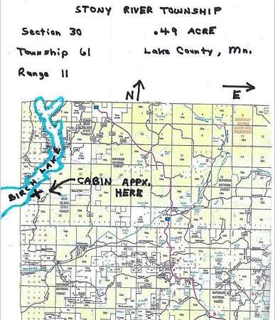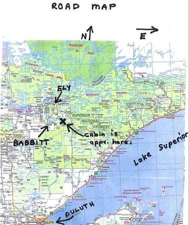 from the Kwik Trip in Two Harbors, from 61 N turn lefton Cty R 26 about 1 mile turn left on hwy 2 - 24 miles at T turn right 1/2mile turn left on Hwy 2 - 19 miles a T turn left on Hwy 1 - 4.3 miles