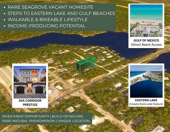 Build your custom coastal retreat on this homesite located on N Lake Drive in the Eastern Lake area of Santa Rosa Beach within Walton County. Positioned near the 30A corridor, this property offers a rare opportunity to own in a location known for its Natural Beauty, coastal dune lakes, and proximity to the Gulf of Mexico. This vacant lot is located between 33 N Lake Dr and 55 N Lake Dr, providing clear and convenient identification for showings and site visits. Enjoy access to Eastern Lake, one of the area's rare coastal dune lakes, along with nearby beach access points, scenic walking and biking paths, and the lifestyle that makes this area highly desirable. The property is surrounded by established homes, supporting new construction and long term value. This parcel consists of approximately 0.17 acres with about 50 feet of frontage and 150 feet of depth, providing a functional layout for a custom home design. No HOA. Public water available in the area. Sewer service present in the neighborhood. Located in Flood Zone X, which typically does Not require flood insurance. Zoned for site built single family residential use, supporting custom home construction in a coastal residential setting. Located just minutes from local dining, shopping, and outdoor recreation, including Grayton Beach State Park and Deer Lake State Park, along with nearby coastal communities along 30A. This property presents an opportunity to build a primary residence, second home, or secure land in one of South Walton's most recognized coastal areas.
