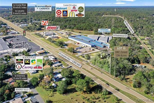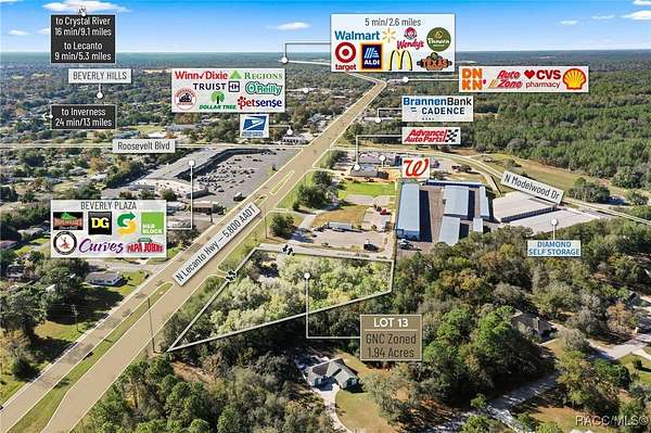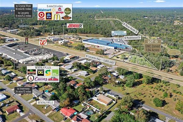 Located in the heart of Citrus County's growth corridor, Lot 13 is an outparcel within the newly developed Golden Gate in Beverly Hills, Florida. This 1.94-acre site is zoned for a variety of commercial uses, including quick-service restaurants (QSR) with drive-thru, automotive services, general retail, and medical or professional offices. It is part of a thriving development alongside established businesses such as Walgreens, Advance Auto Parts, and the new Pizza Hut with drive-thru. The property offers excellent visibility with over 195 feet of highway frontage along Hwy 491 and convenient access via the signalized intersection at N Modelwood Drive and Hwy 491. Multiple points of entry, including three from CR 491 and two from N Modelwood Drive, provide seamless connectivity to adjacent parcels through a cross-access service road, with both front and rear access to the parcel. Just 2.8 miles north of the Central Ridge regional shopping district, this location is near major retailers like Walmart, Target, Aldi, Hobby Lobby, Texas Roadhouse, Panera Bread, 7-Eleven, and other national and regional brands. The site is cleared and ready for development, with access to offsite retention for maximum lot utilization, and city water and sewer lines already in place. Additionally, shared signage will enhance the visibility of businesses located on the property. Disclaimer: All information provided herein is for marketing purposes only and is not guaranteed for accuracy. Prospective buyers or tenants are encouraged to conduct their own independent due diligence. The seller, broker, and associated parties make no representations or warranties, expressed or implied, as to the accuracy or completeness of this information. All dimensions, zoning details, financial data, and other property-related facts should be independently verified. Please consult with appropriate licensed professionals before making any investment or purchasing decisions.