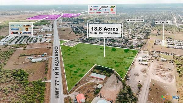 This 18.8-acre commercial tract offers exceptional visibility along N. Navarro (Hwy 77) and Northside Road with a 15,400+ daily traffic count. Located in one of Victoria's most active and rapidly growing commercial corridors, this property is positioned perfectly for a wide range of commercial development opportunities. The site is surrounded by major national retailers, including Walmart, Sam's Club, Academy, Kohl's, Tractor Supply, and Lowe's, along with numerous dining and service options. A new retail addition is underway next to Academy and Kohl's that will feature space for seven retailers or restaurants. Burlington Coat Factory, Five Below, and Ulta Beauty have already signed leases. Nearby residential communities such as Saddlebrook, Tuscany, Capstone Estates, and Terra Vista help support strong local traffic and consistent consumer demand. With its large size and flexible layout, this tract is ideal for retail, service businesses, medical, office, or multi-parcel development. The combination of frontage, visibility, surrounding growth, and ongoing commercial expansion creates a valuable opportunity for developers and investors seeking long-term potential. This is a premier commercial land tract with high exposure, strong nearby development, and excellent positioning for future success.