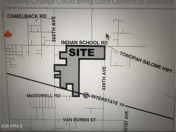 Coyote Ridge in Tonopah represents a prime opportunity, often referred to as the''Scottsdale Rio Verde of the West.'' The area is poised for significant growth, with a future Data Center development planned I-10 & Indian School Rd between 339th-355th Av. The parcel is identified with a red dot (photo 1). N. of I-10 and Indian School Road at 371st Ave, this 5.227ac flat parcel is situated about 2.5 miles of I-10, Tonopah Elem. & High School. Utilities are conveniently located within 500'(TBD) west of the property. The parcel is also about 2.5mi. west of the future HWY 11, which will connect Nogales to Las Vegas. The ''Conceptual Survey'' (not recorded) suggesting 4 lots. It can remain a single five-acre parcel or be divided into one-acre minimum lots to suit your specific needs.