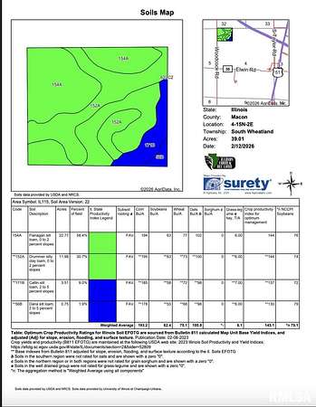Must see Class A Macon County, Illinois tillable farm. High-quality tracts in this area are tightly held, and this farm represents an outstanding investment opportunity in the heart of Central Illinois. The property boasts an impressive 143.1 Productivity Index, consisting primarily of Flanagan Silt Loam and Drummer Silty Clay Loam soils-two of the most sought-after soil types in the region. This soil makeup supports strong, consistent yields and long-term productivity. Located just south of Decatur and one mile west of Elwin in Section 4, T15N-R2E, South Wheatland Township, the farm offers convenient access and excellent logistics. The tract features solid hard-road frontage along the west side, providing easy access for equipment and grain hauling. Additionally, there is a 65-acre tract located three-quarters of a mile south of this property that is also available, presenting a potential opportunity for expansion. SCHEDULE YOUR SHOWING TODAY!